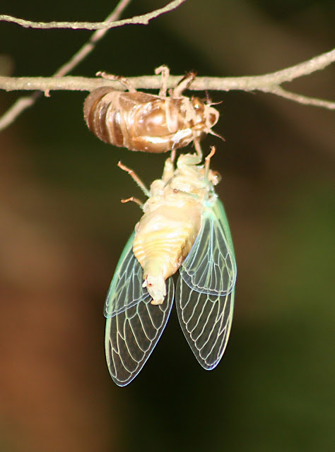 | Another Neotibicen latifasciata nymph emerging on branch |